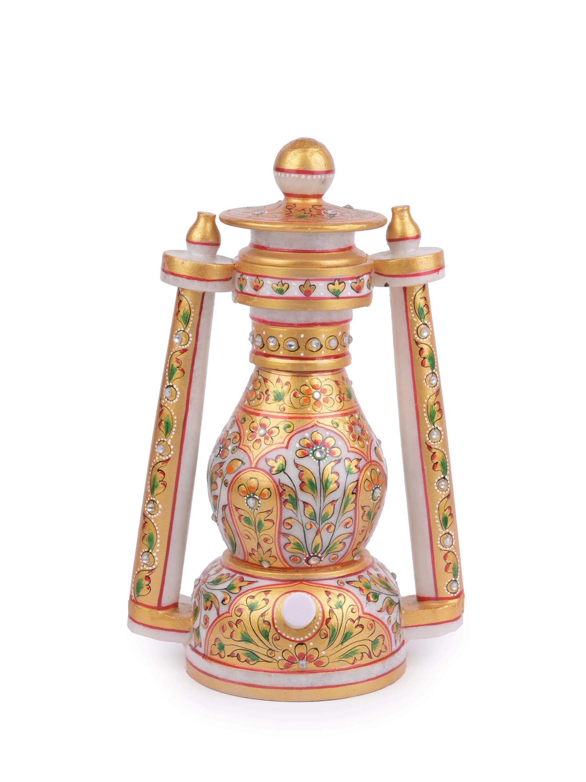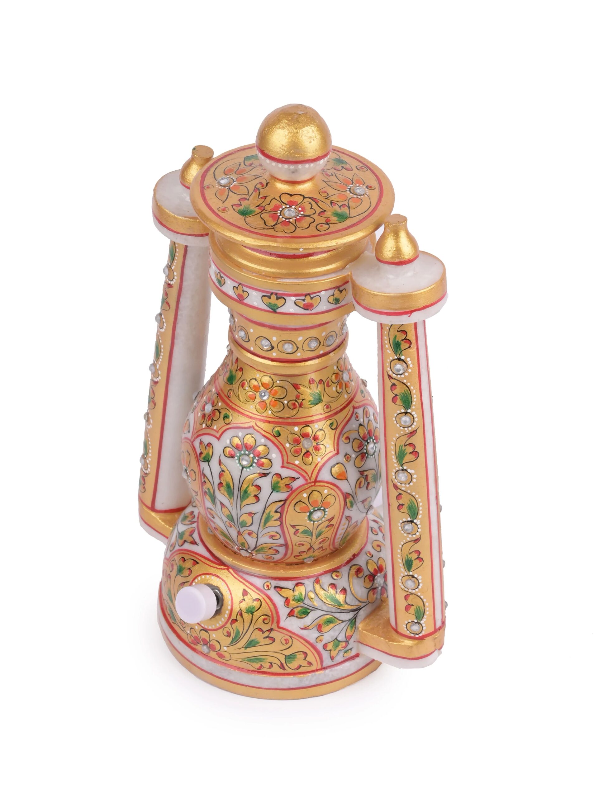 Here comes a lantern, flawlessly hand painted over marble and ready to win hearts because of its lustrous appearance. It comes with multi colored lights when plugged in, so apart from a showpiece, you can use this as a real lamp also.