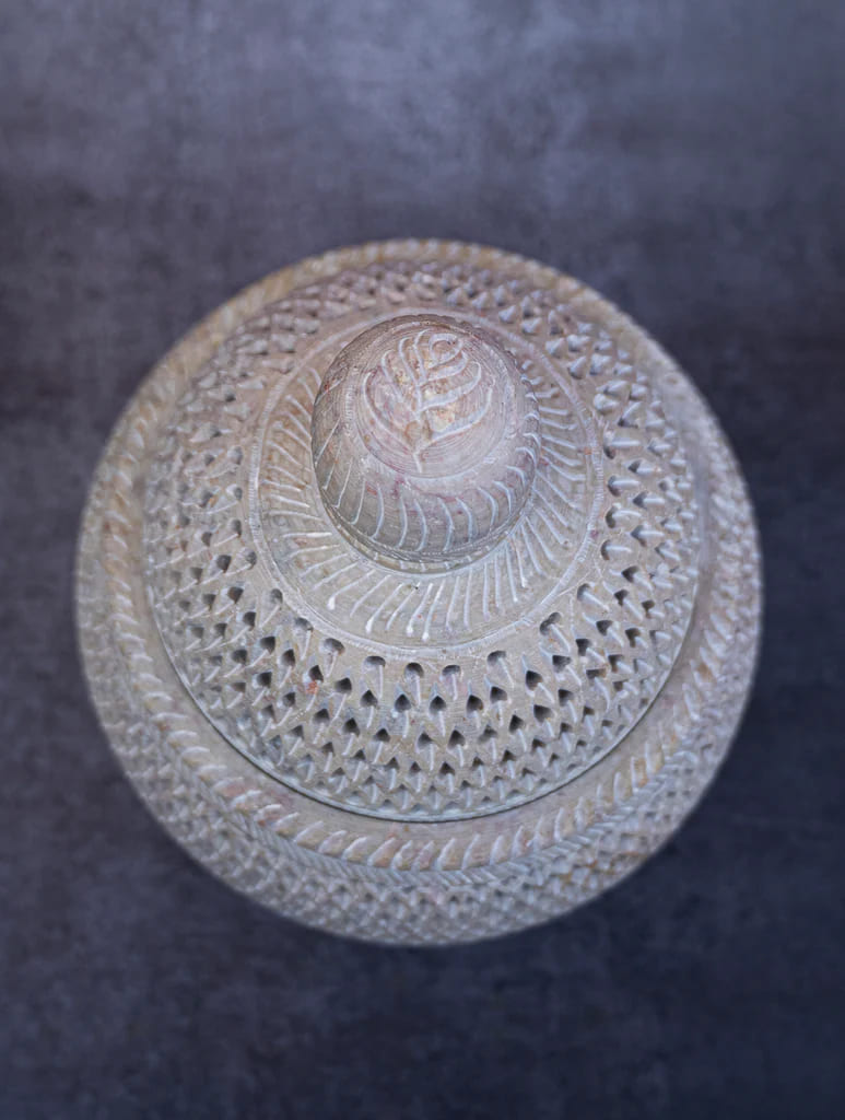 This remarkable round container, skillfully carved from soapstone, represents more than a decorative piece – it’s a historical artifact that tells a story. The detailed lacework patterns, reflecting 17th-century Mughal artistry, display elegant botanical and mathematical designs within the stone’s surface.