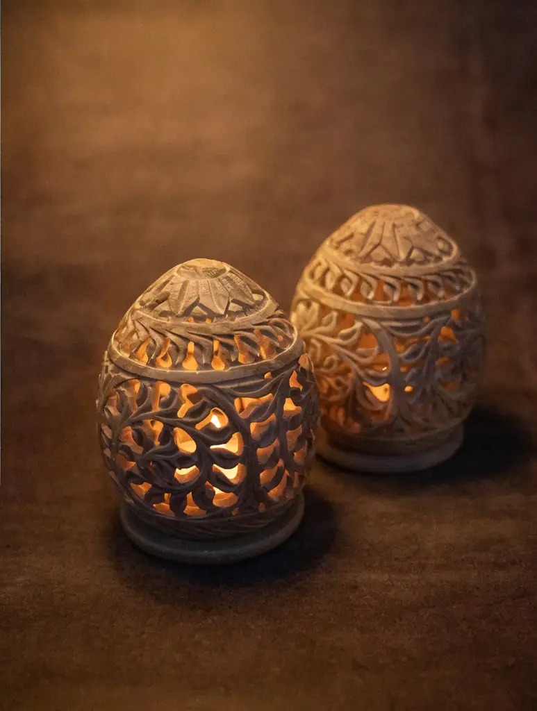 These elegant table tea light holders, skillfully carved from soapstone, serve as both functional decor and historical artifacts. The detailed lattice patterns, reflecting Mughal artistic traditions from the 1600s, feature precise botanical and mathematical designs embedded within the stone’s surface.