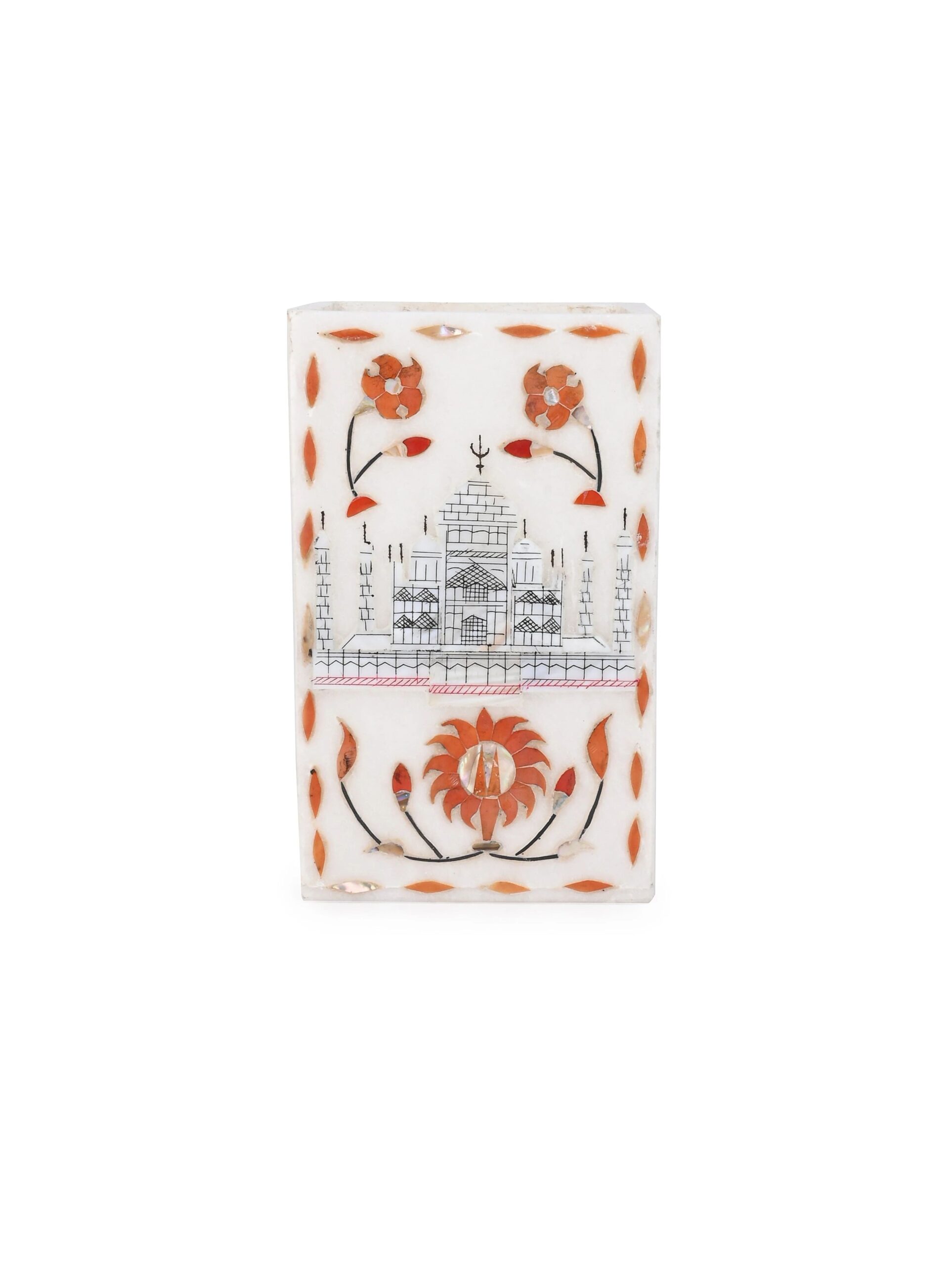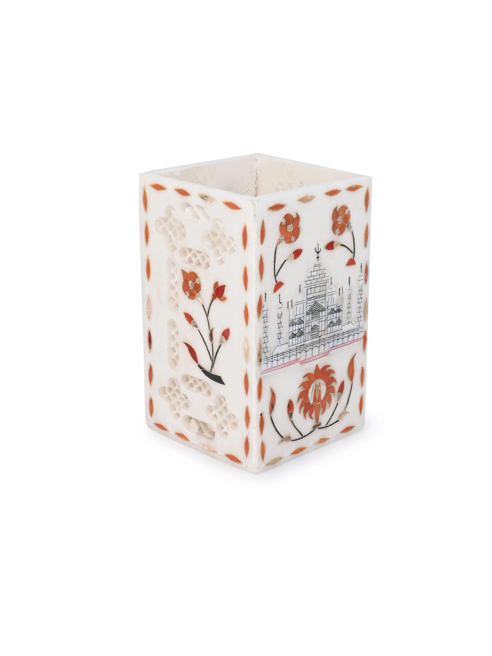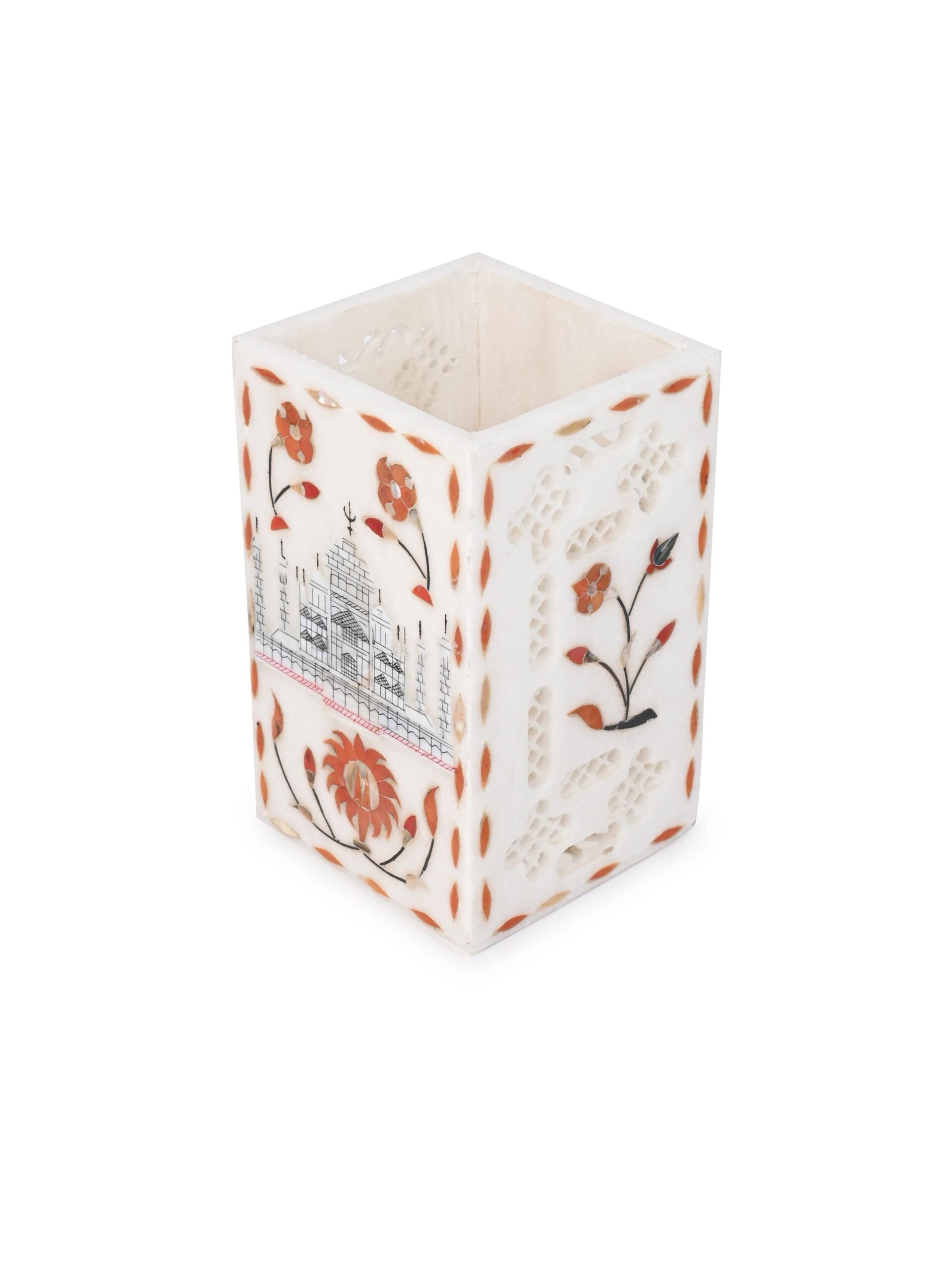 An elegant & versatile multi-functional container suitable for holding writing instruments, office supplies & stationery, bathroom accessories or dining utensils. Expertly crafted using premium quality marble, featuring detailed engraving and intricate inlay designs throughout. A desirable addition to any home/workplace setting and an excellent choice for presenting as a gift.
