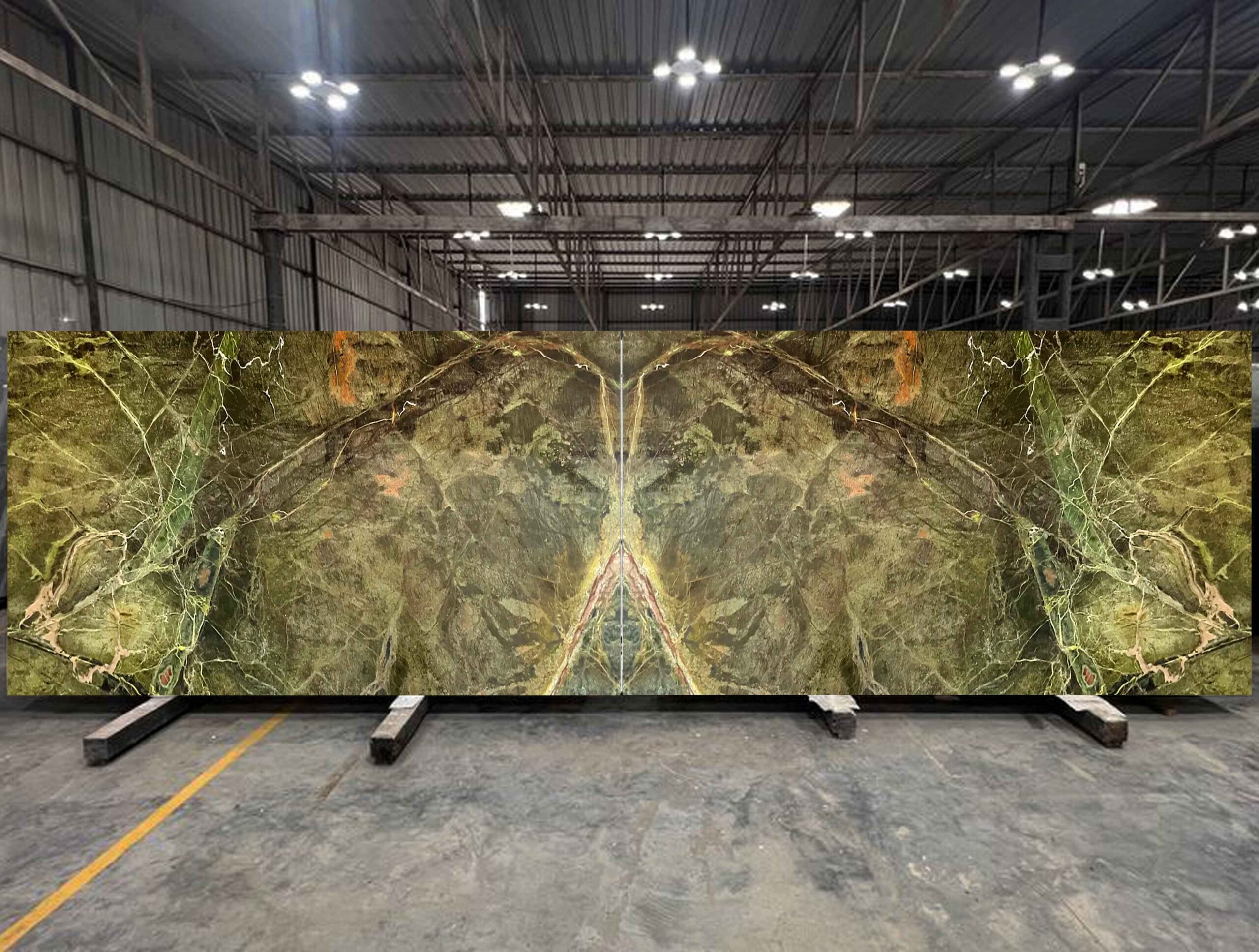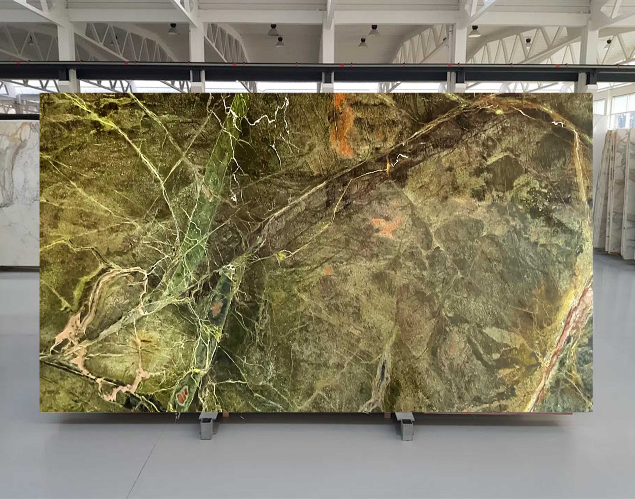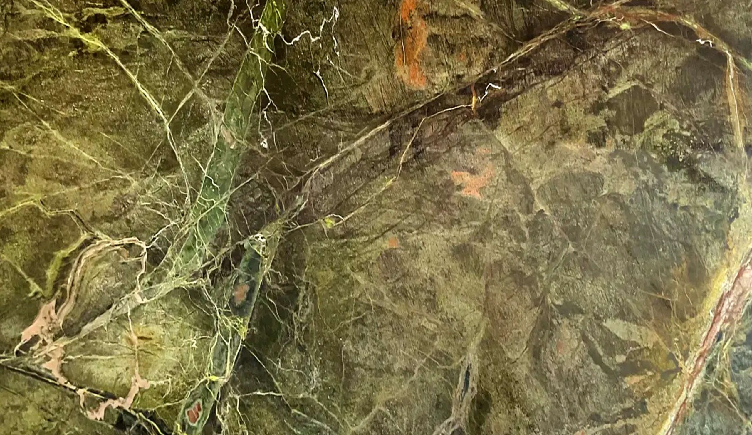 Rainforest Green marble, also known as Bidasar Green marble, is a natural stone characterized by its deep green background and contrasting vein patterns that resemble the branches of a tree or the roots of a plant.