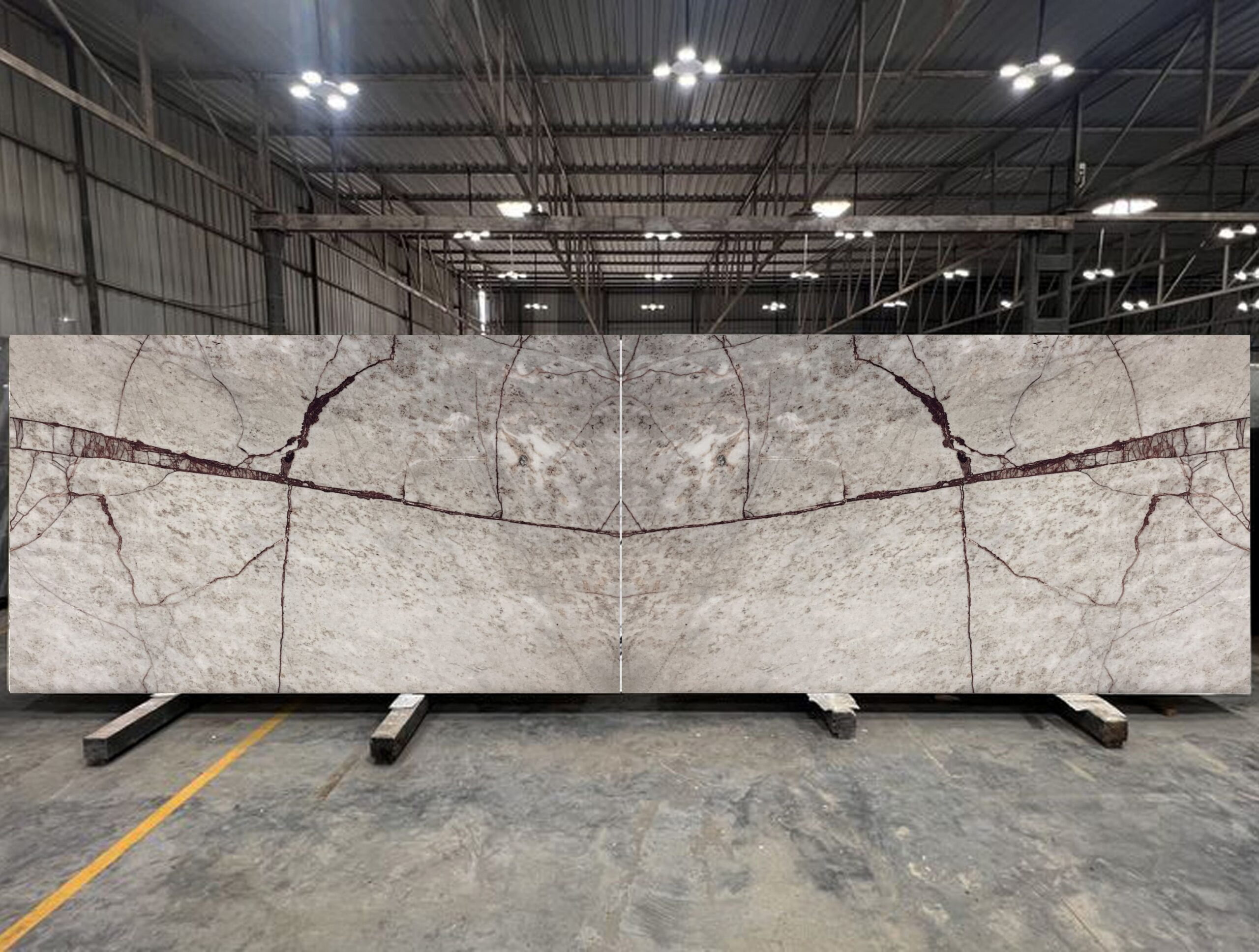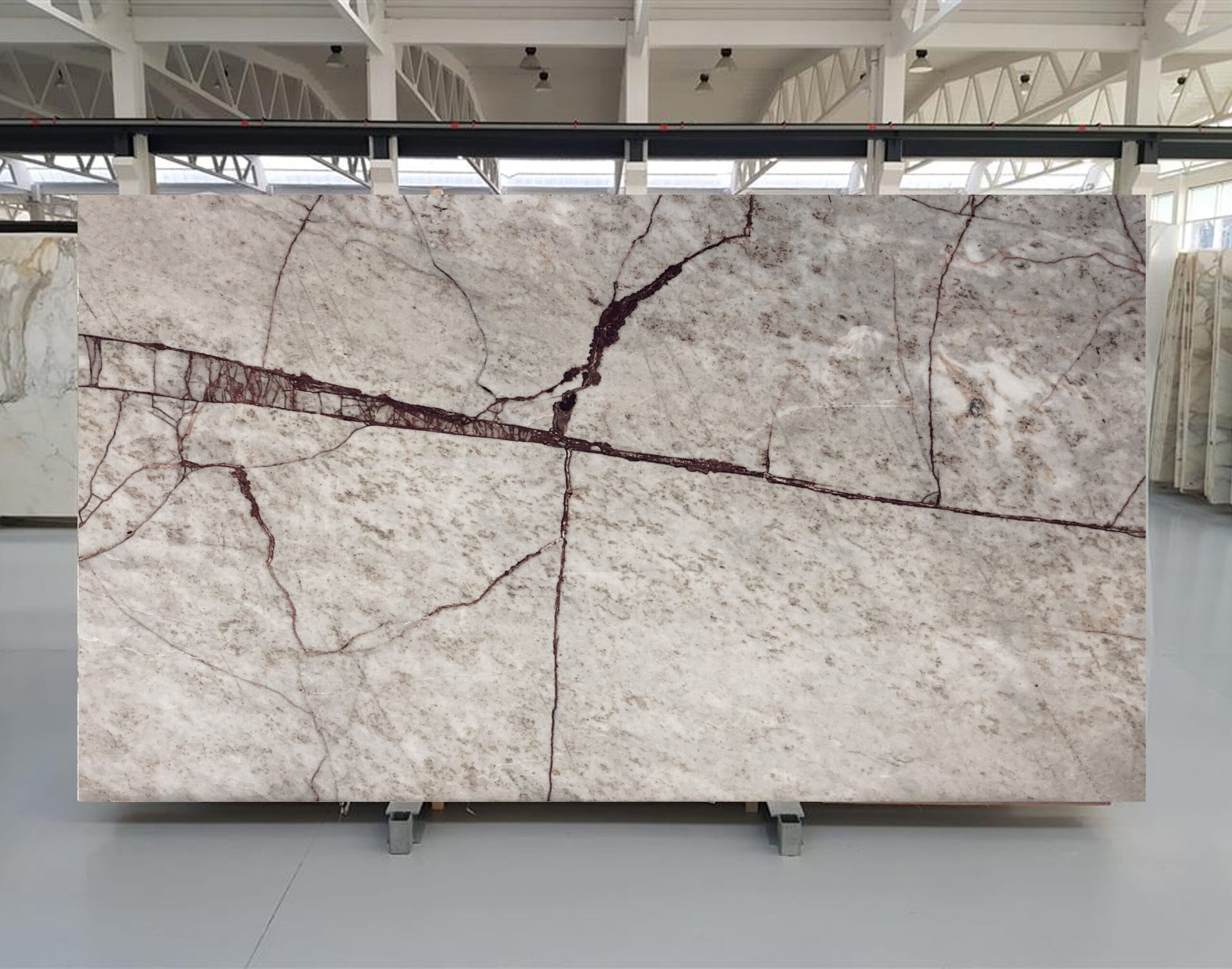 The marble exhibits a light and charcoal backdrop with deep, meandering lines that flow unevenly and produce a broken look throughout the stone’s face, forming a spontaneous, lifelike design across its surface.