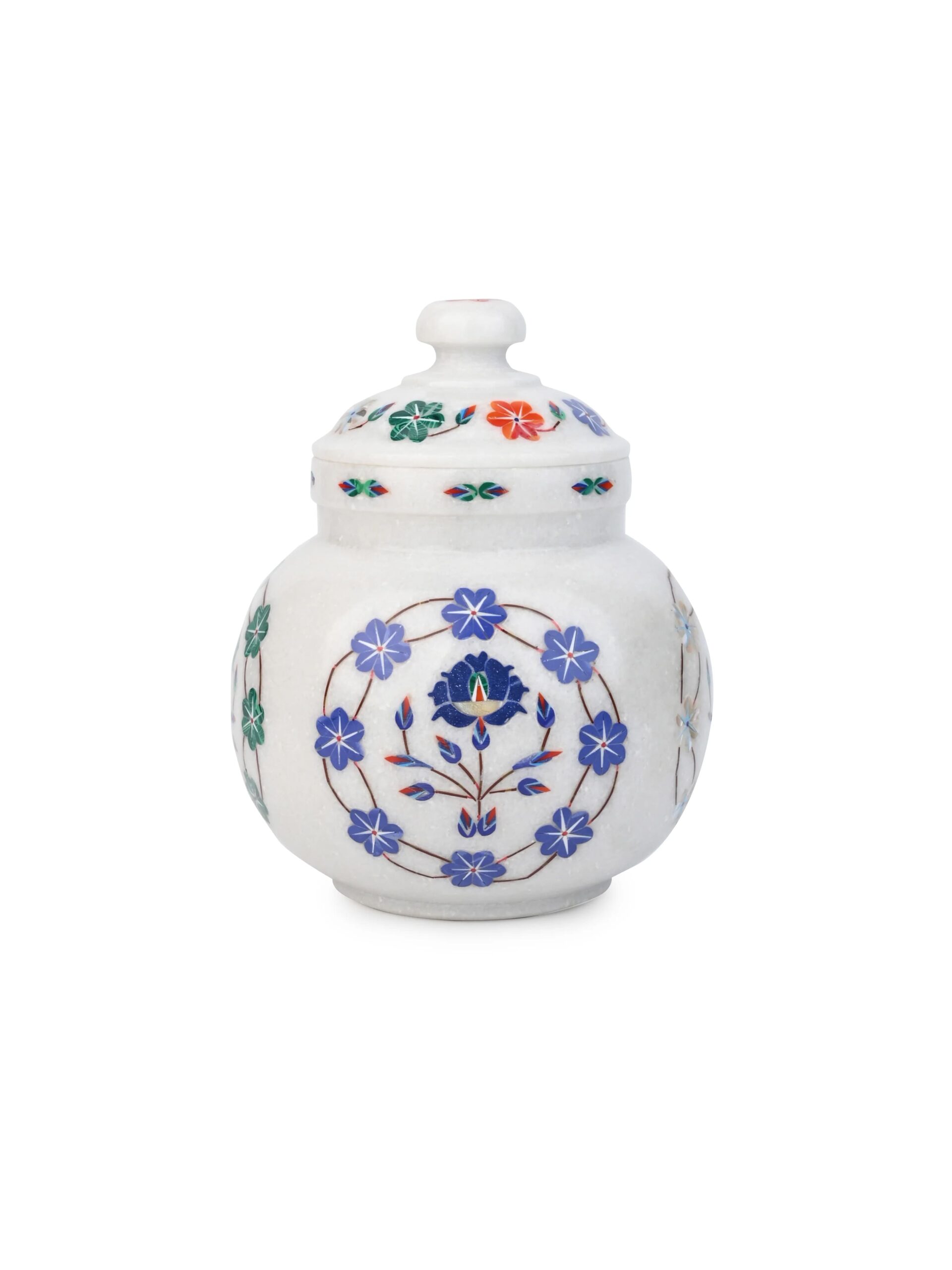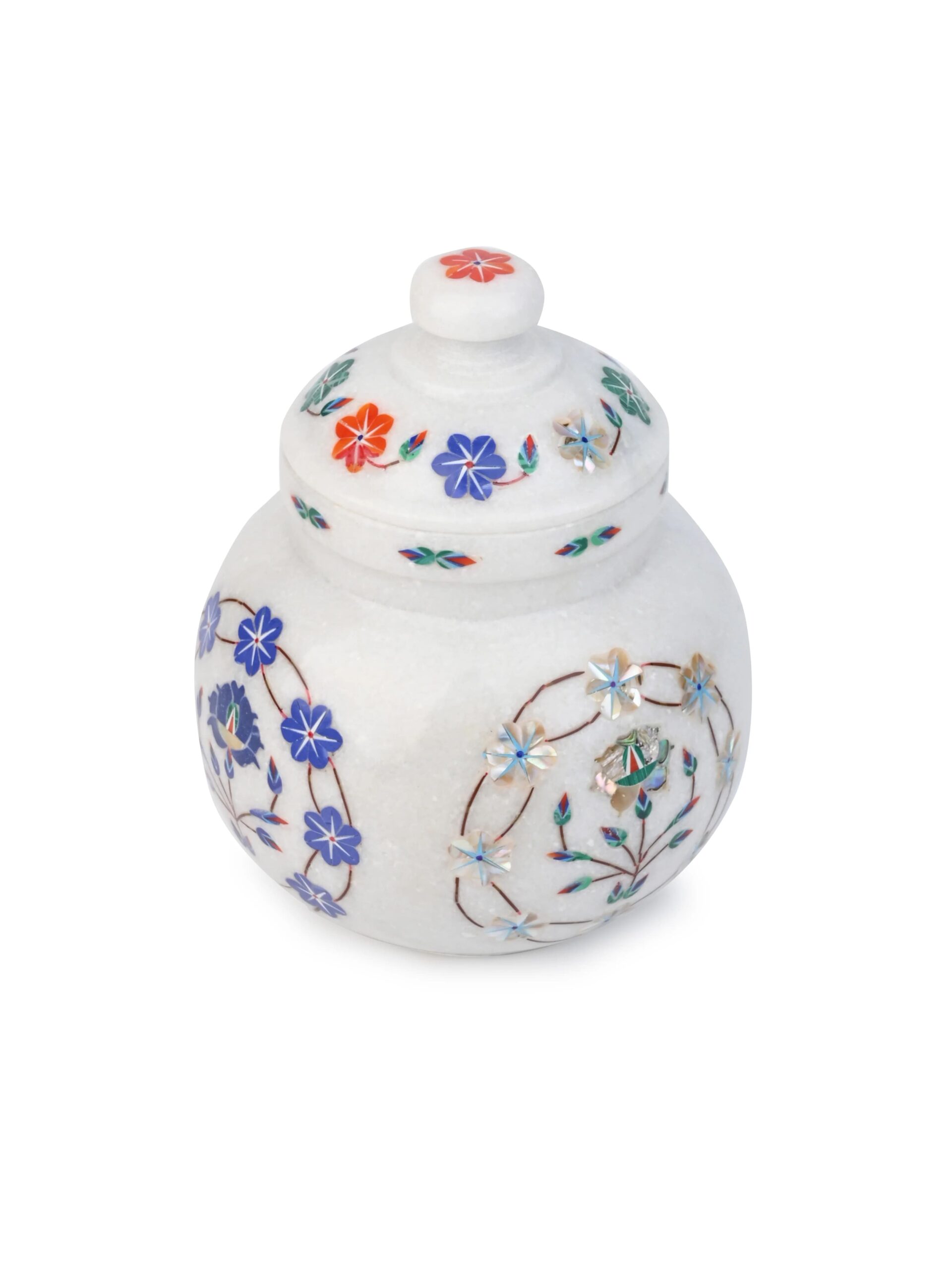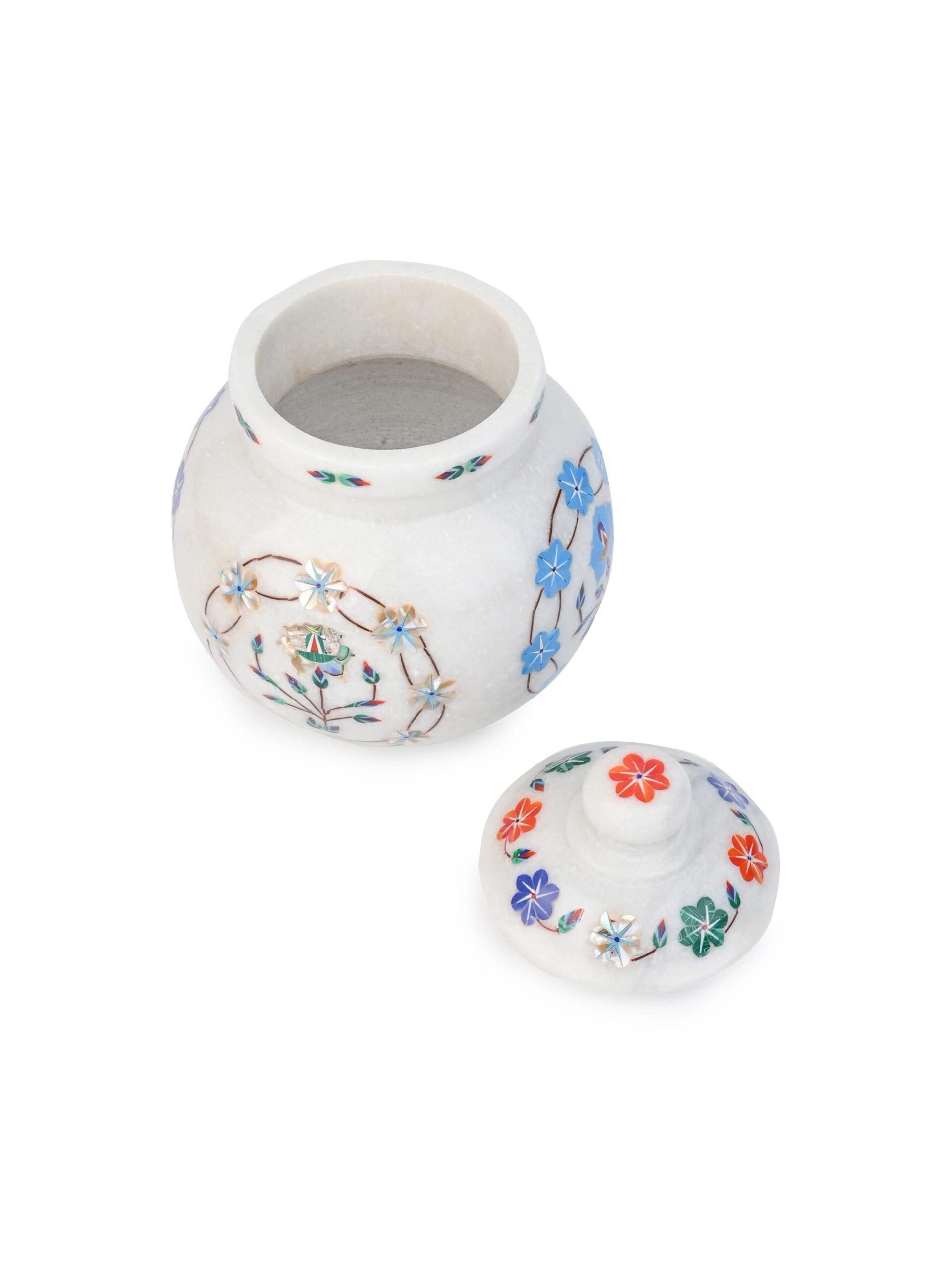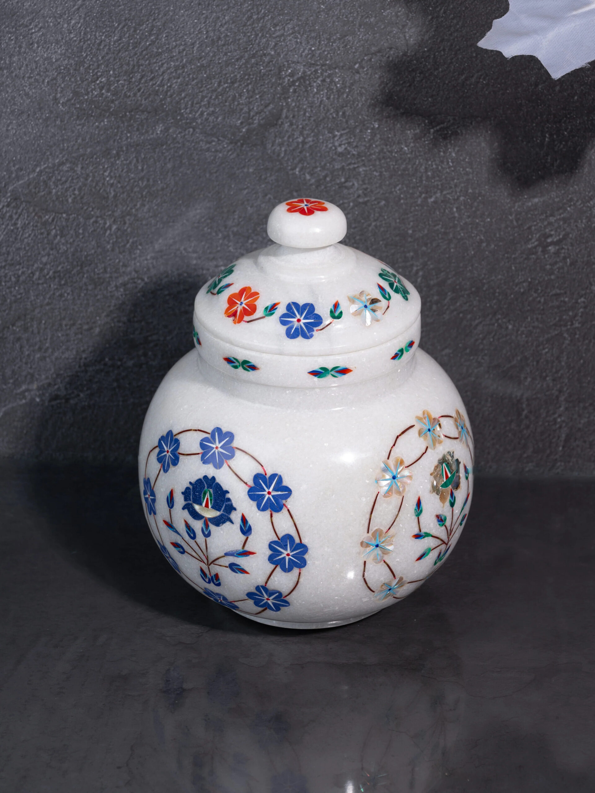 Solid Marble Crafted Vaastu Kalash with Lid and Colorful Inlay Work